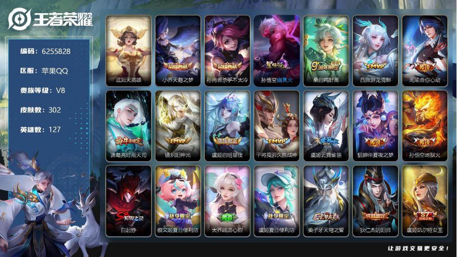 【V8 荣耀黄金 英雄数量:127 皮肤数量:302 荣耀典藏:3个 星传说:1个 传说皮肤:10个 稀有限定:7个 皮肤价值:228836】苹果Q-V8-荣耀黄金II段位-127英雄-302皮肤-2典藏-0珍品无双-0无双-0珍品传说-10传说-80史诗 【英雄全皮】:蒙恬全皮,影全皮 【荣耀典藏】:武则天英雄,小乔天
